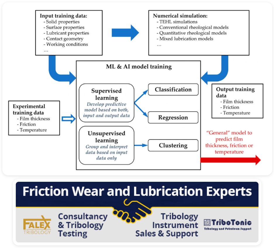 AI và ML đang được phát triển để dự đoán chế độ bôi trơn trong hệ thống ma sát bằng cách phân tích các thông số chính như tốc độ, tải, nhiệt độ và độ nhám bề mặt. Hiểu được chế độ bôi trơn giúp xác định điều kiện tiếp xúc, ma sát và đặc tính mài mòn, cải thiện việc bảo trì do AI thúc đẩy và lựa chọn vật liệu. Có ba chế độ bôi trơn chính: