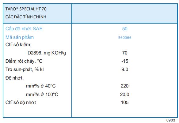Dầu nhớt bôi trơn xi lanh Caltex Taro® Special HT 70 được khuyến nghị dùng bôi trơn xy-lanh của tất cả các loại động cơ diesel hàng hải thấp tốc vận hành với công suất riêng lớn và chịu nhiệt độ cao. Taro Special HT 70 được chấp thuận bởi MAN, Wästsilä và Mitsubishi Heavy Industries để sử dụng cho các thế hệ động cơ mới nhất.